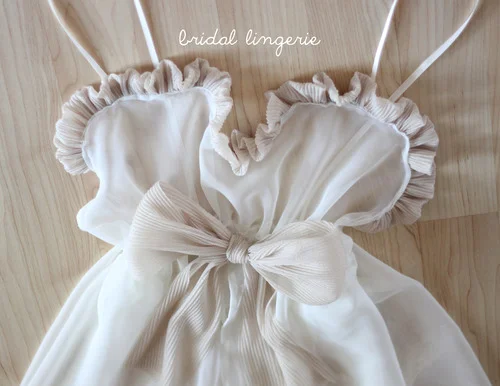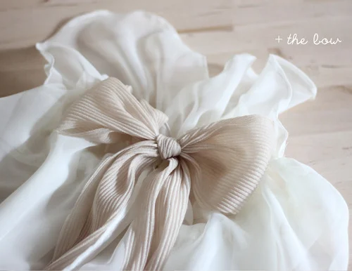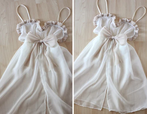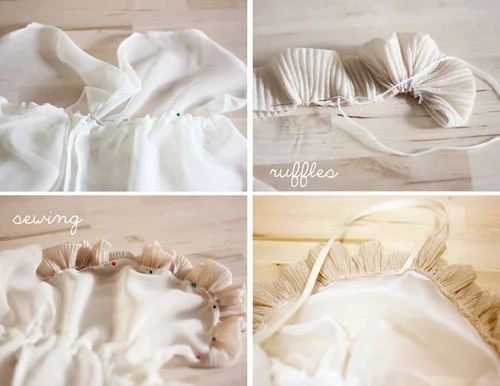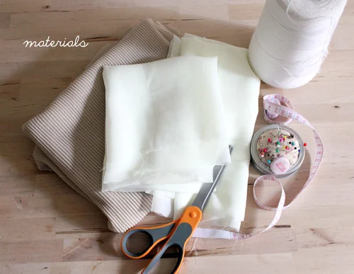 Materials include: 1.5 yard of ivory chiffon, .5 yard of nude/blush pleated organza, thin satin ribbon for straps, scissors, needle and thread, and a sewing machine.