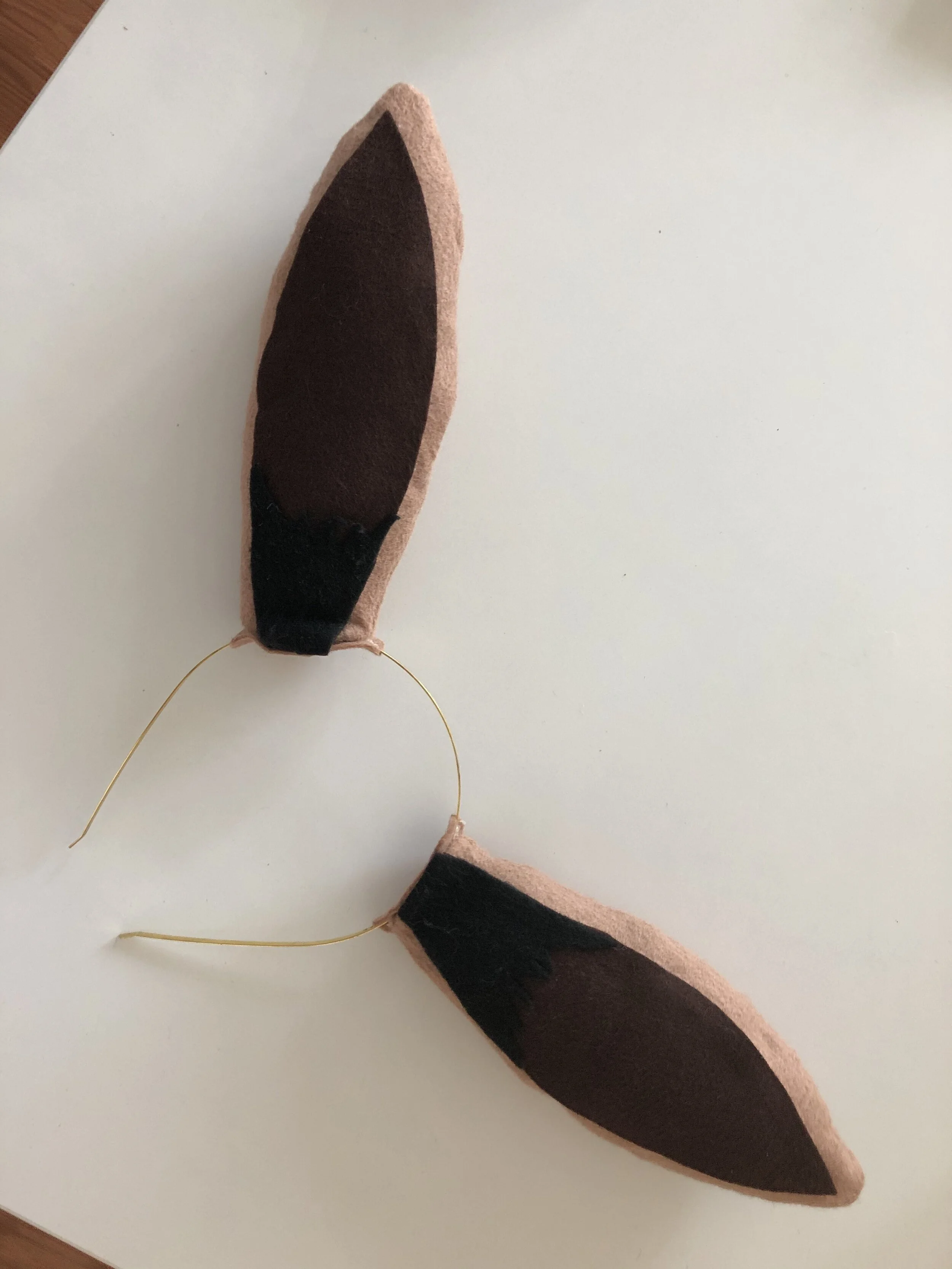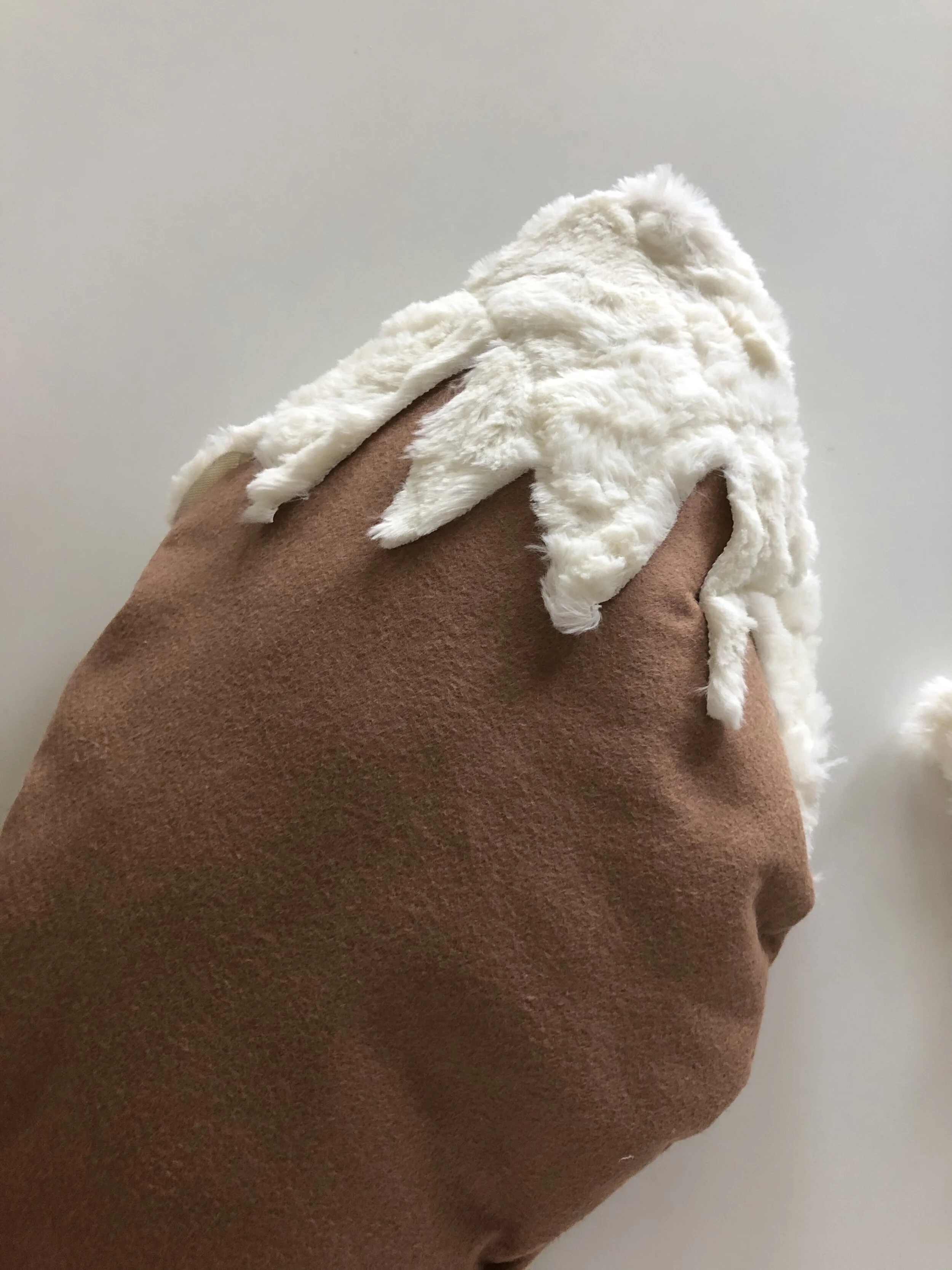 Different shades of brown with a furry fabric all from Joann’s. I attached the ears onto the headband and I had to do the tail. I sewed a basic dress pattern. Originally had it with long sleeves but it felt a little too stiff so we decided to cut the arms to make them into short sleeves.