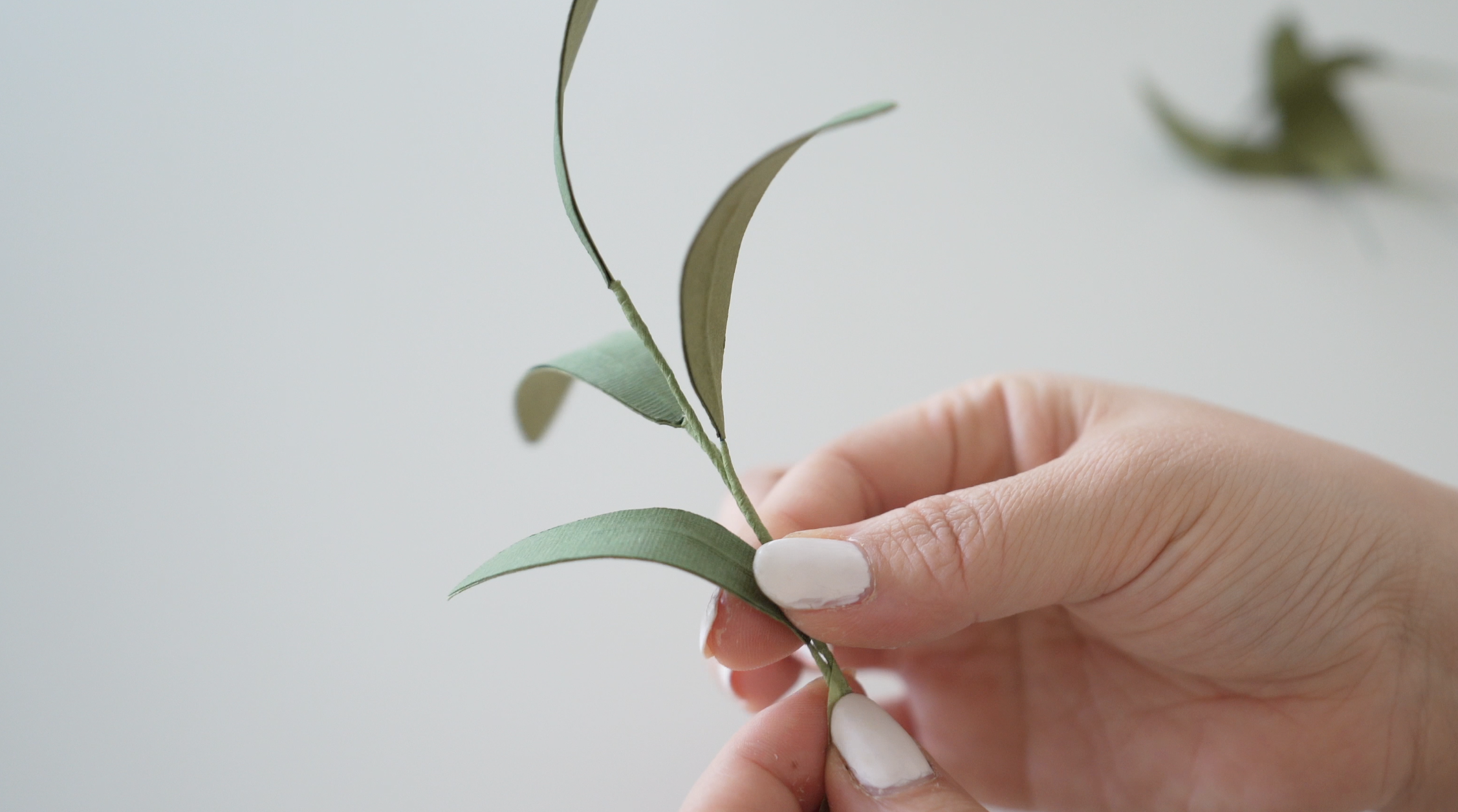 Then the thicker branches that will be the main branch will need a thicker floral wire, start at the top with one leaf, move downward adding 1–2 leaves at a time, add olive between leaves, attach smaller branches to the sides.