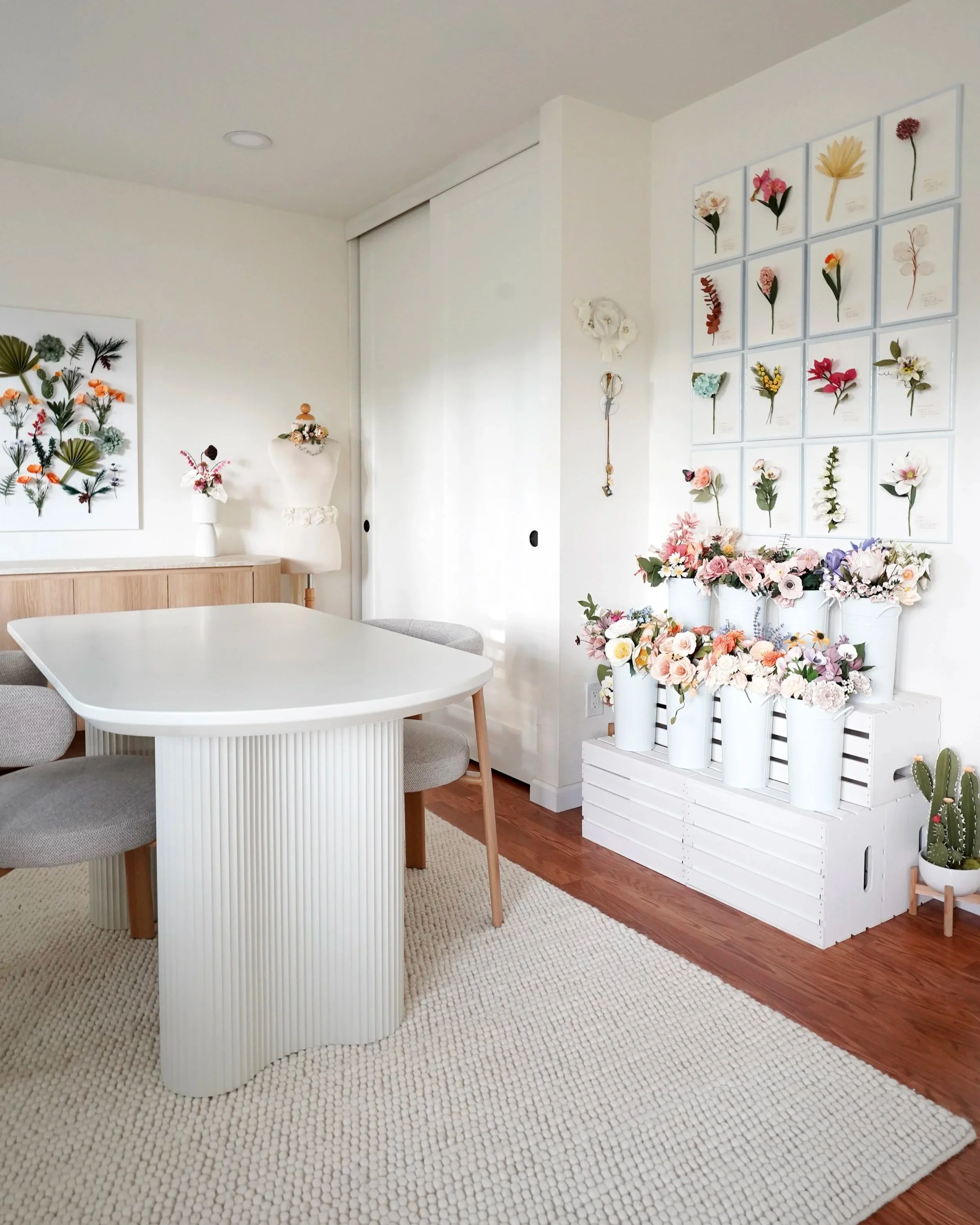 It’s where the creativity starts, but it’s also decor in its own right. A wall of paper blooms brings energy and inspiration into the room and reminds me that handmade art belongs in our homes.