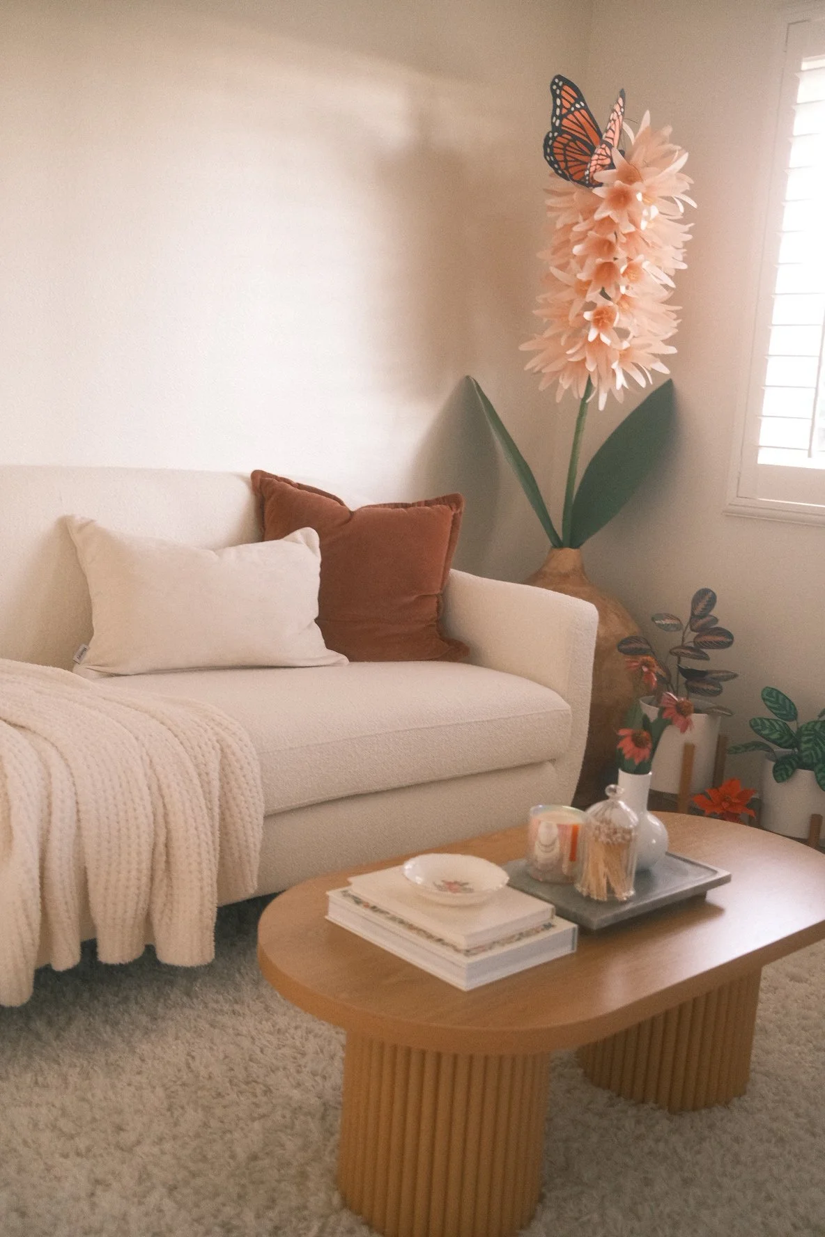 In my living room, I styled a paper dogwood on the end table for a subtle floral moment.