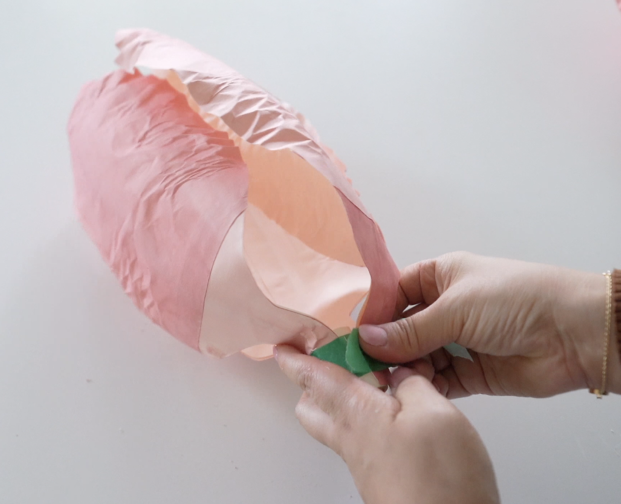 Wrap green crepe paper around the PVC pipe and secure it with glue. Attach the tulip to the stem, and your giant paper flower is complete!
